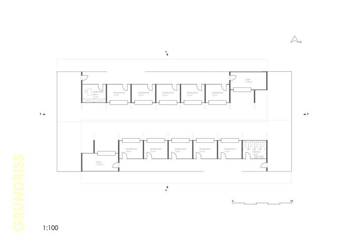 Die Markthalle fügt sich aus zwei unabhängigen Gebäudeteilen, welche gegeneinander verschoben sind, zu einer Einheit zusammen.